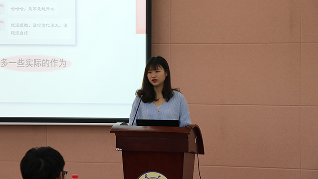 紧接着,来自马克思主义学院的王钰洁同学向同学们讲述了她的故事。从天生缺陷的低估起步,到如今破茧成蝶的蜕变,王钰洁凭借着自己踏实的勤奋努力,多次获奖学金,同时也荣获全国大学生马克思主义理论学习夏令营优秀营员、edddh