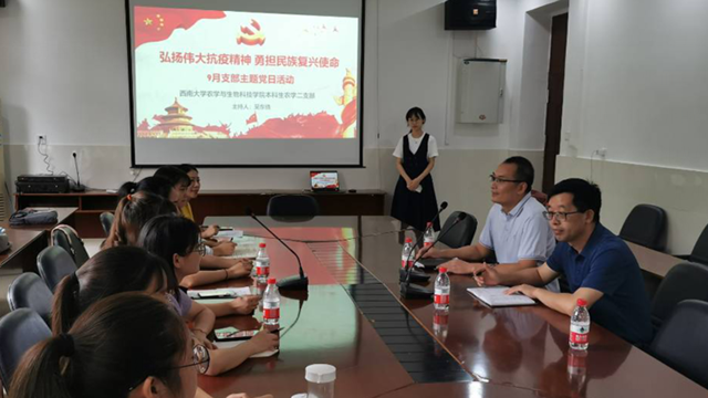 9月11日下午,赵国华副校长深入我院本科生农学二支部指导开展“弘扬伟大抗疫精神,勇担民族复兴使命”主题党日。学院党委书记阳义健、组织员薛中华和党支部全体党员参加活动,党支部书记吴东倩主持活动。