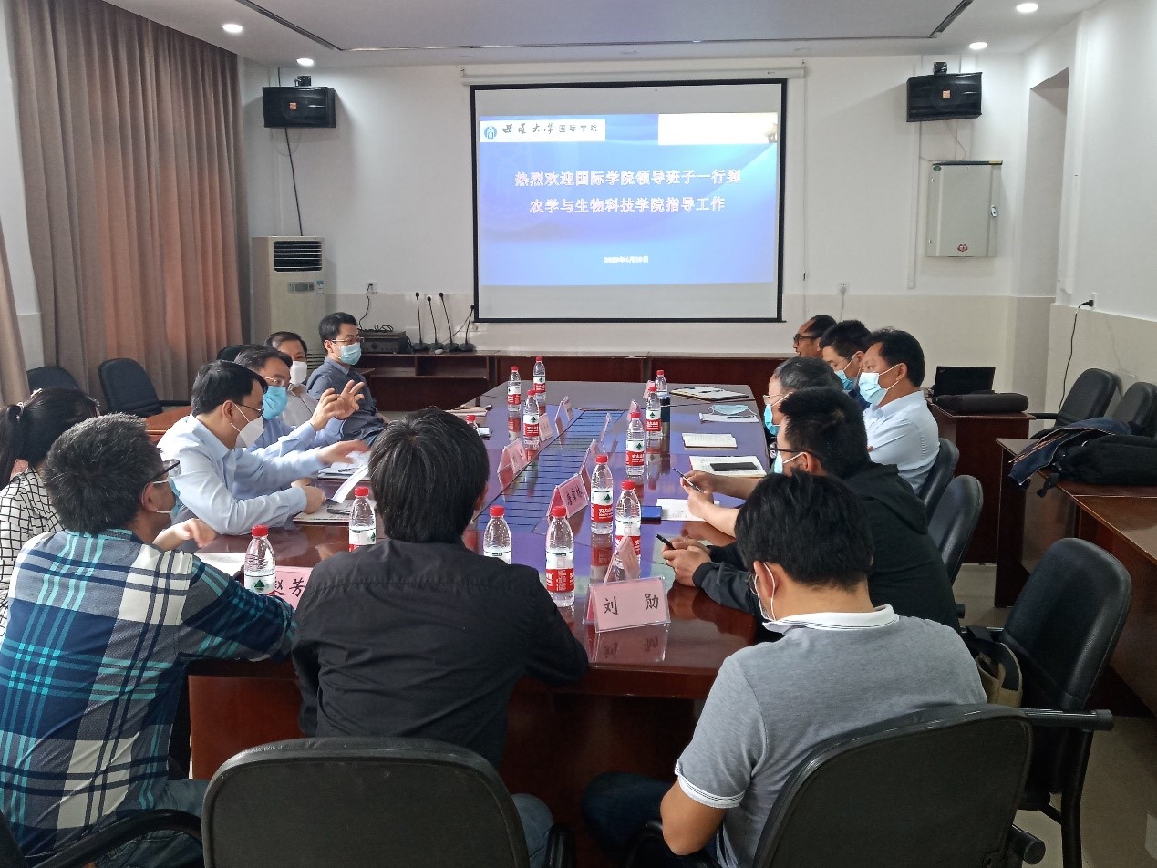 4月29日下午,国际学院党委书记刘猛、院长刘承宇、副院长李航、张家政、教学秘书刘燕妮一行5人到我院调研来华留学生招生与培养工作。学院党委书记赵子华、副院长唐章林、张建奎等领导及学院留学生导师代表张正圣、郭彦军、赵芳明、刘勋、周永洪、院长助理刘志斋等参加了调研座谈。