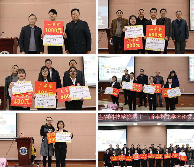 一番激烈的学术思想碰撞交流后,决赛最终评出优秀奖四名(奖金200元),三等奖三名(奖金400元),二等奖两名(奖金600元),一等奖一名(奖金1000元),最佳展演奖一名(奖金200元),指导老师也将获得相同金额奖金奖励。学院党委书记赵子华宣读比赛结果,2017级隆平班姚婉玥的作品《C2H2锌指转录因子调控水稻叶宽发育的分子机制研究》荣获最佳展演奖,2016级神农班远俊虎团队作品《利用TRV-HIGS技术鉴定核盘菌致病相关的分泌蛋白基因》荣获一等奖,团队成员范玉轩同学全英文的PPT和精彩的讲解让在场观众耳目一新;2017级隆平班万应春作品《水稻coiled-coil结构域基因DMS1的鉴定与表型分析》和2017级隆平班姚婉玥作品《C2H2锌指转录因子调控水稻叶宽发育的分子机制研究》荣获二等奖;2017级隆平班周悦作品《水稻黄绿叶突变体ygl30的表型鉴定及遗传分析》、2017级隆平班杨洋团队作品《玉米植株节间数与节间长度的表型分析与QTL定位》以及2017级隆平班彭洪娴作品《基于碘染法高效检测马铃薯直链和支链淀粉含量比的方法》荣获三等奖;2017级隆平班宫玥团队、2017级隆平班张佳宇、2018级区域一班刘玲洁、2017级隆平班邓岢莉团队荣获优秀奖。学院领导和评委老师为获奖选手颁发奖状和奖金,并合影留念。