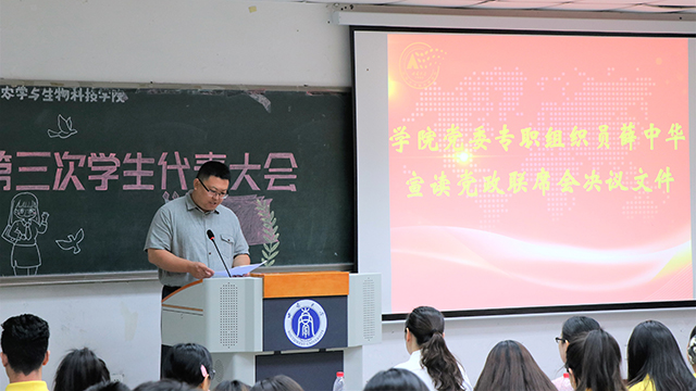 正式会议中,首先由学院党委书记赵子华宣读学院党委批复并讲话。他对筹备大会的老师同学的辛苦付出表示了肯定,并合习近平总书记七年知青岁月的奋斗经历,以及对当前农科人才培养目标,向在座的学生代表们提出了要求并寄予厚望。接着,edddh