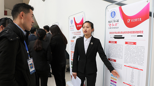 中心图书馆隆重举行。在这场学术盛事现场,来自农业、文化、互联网等多个领域的参赛团队进行最终的终审答辩环节,吸引了众多学生驻足观摩。终审展示现场,发明制作、自然科学及社会科学等各类别作品以展板或样品的形式呈现出来,评委老师们细致观察了展示的作品模型,观看了作品的说明展板,也聆听了各个团队的详细讲解。我院党委副书记方凤玲、副院长张建奎、团委书记许莹竹、作品指导老师刘志斋莅临现场为我院参赛团队选手指导并加油。