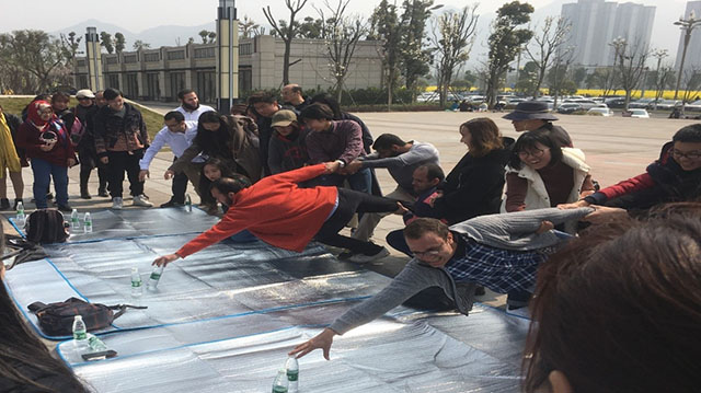午休过后,同学们全身心投入到素拓游戏中。本次素拓活动采取了分组计分的形式。“群龙取水”游戏中,每组留学生们凭借身高腿长优势轻松完成;