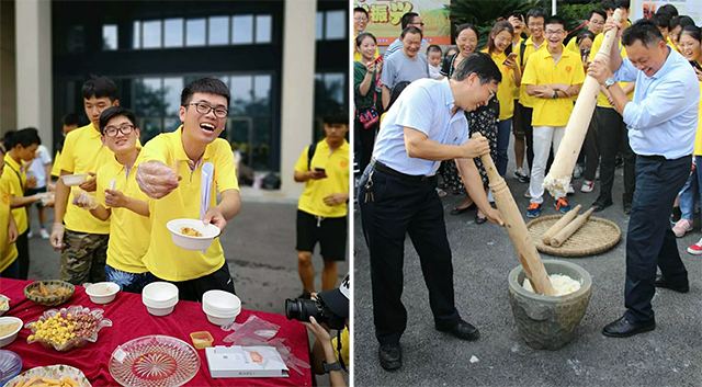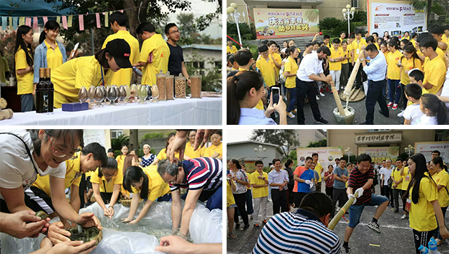 农学与生物技术学院师生一早就备齐了农作物、扁担、木棍等等游戏道具。“颗粒归仓”、“摸泥鳅”、“拔扁担”、“猜谜语”、“打糍粑”。碓窩、擂簸、扁担在60、70、80、90、乃至00后的手中交换着,水稻、红薯、油菜、玉米、烟草、荞麦、土豆统走出实验室、实验田,今天在大家眼里,它们不再是实验数据,而是快乐的源泉。这些早已渗透在农民生活和辛苦劳作中的农事,却在今天,变成了师生们欢声笑语所在,承载了大家满满的乡愁和丰收的喜悦。