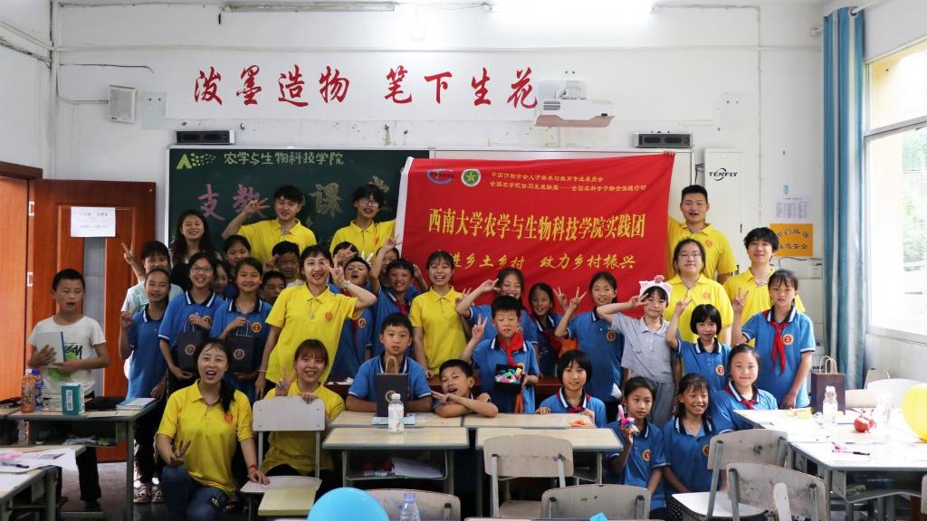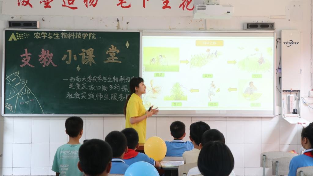 党委副书记郑莉佳沟通交流,对实践队的系列支农、支教活动表示高度赞扬并寄予期望,希望实践队能真正为乡村振兴的发展助力。在重庆市城口县咸宜中心小学,实践队员以支教课堂为纽带,致力乡村教育,积极传播新思想、新文化、新理念,开展了以“课堂实验传知识,隆平精神永流传”为主题的乡村支教志愿活动,以“隆平爷爷故事讲述” “农业植物双语科学科普” “科研趣味小实验”等丰富多彩的支教课程,为小学生开展农业知识、植物知识科普,提升当地学生视野,增强他们对农业科学和大自然的情感和热爱,激发孩子们对于科学实验的兴趣,为他们种下一颗梦想的种子。