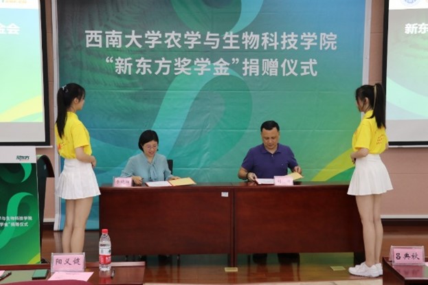 奖助学基金”,用于资助学院国际教育。吕典秋院长与韦晓丽女士签署了合作协议。刘涛副秘书长代表学校基金会与新东方前途出国重庆公司签署了捐赠协议,并颁发捐赠荣誉证书,吕典秋院长接受捐赠支票。
