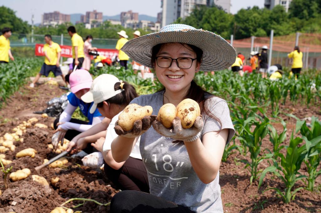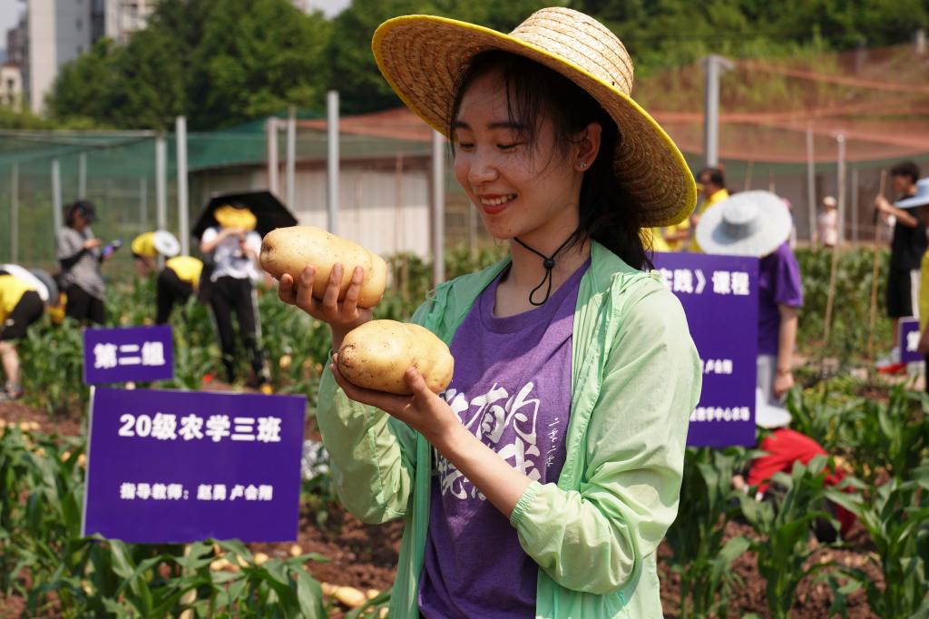 2020级农学专业隆平班的刘亦婷同学在收获了自己种的马铃薯后开心地表示:“虽然每次锄地手上都要长水泡,的确很劳累,但是看到自己种植的白白胖胖的土豆,觉得此前起垄、改膜、浇水、施肥所花的功夫都没白费。我们平常学习的都是理论知识,种植马铃薯是一次将理论付诸实践的难忘经历。”