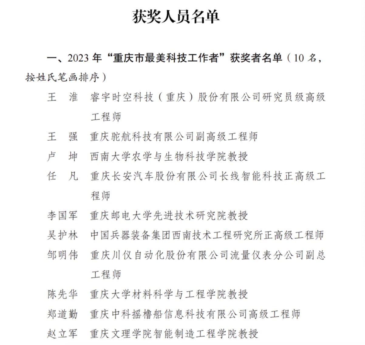 为激发广大科技工作者的荣誉感、自豪感、责任感,去年以来,重庆市相关部门开展了2023年重庆市“最美科技工作者” 选树宣传活动,通过单位推荐、资格审查、专家评审、综合评议等程序,最终产生2023年重庆市“最美科技工作者” 及提名奖名单。