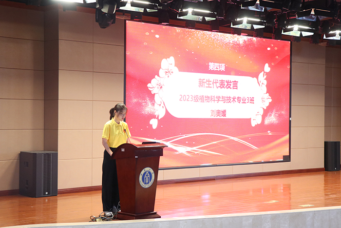 2023级本科生植物科学与技术专业刘奥媛同学代表新生发言。她向大家分享了过往的成长经历,以及对大学生活学习的憧憬,她表示,作为一名农生学子,将励志践行“心系三农,顶天立地”的学院精神,在未来的大学生活奋激勃发,在人生的新阶段收获学业和人生旅途的硕果。