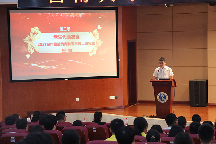 2021级作物遗传育种专业硕士研究生张帅同学作为老生代表发言,他通过自身的成长和奋斗经历,鼓舞同学们努力进取,为未来争取光明前景。