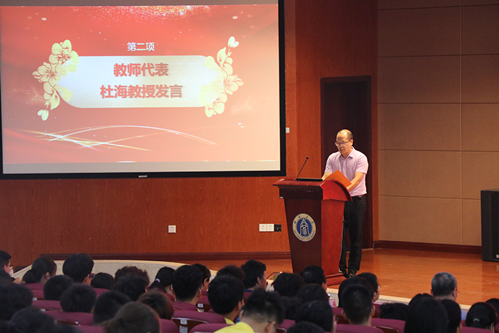 教师代表杜海教授在发言中,以丰富的从教经历告诫同学们“进入大学不等于放松,未来还有更多的挑战等着大家”,他指出,大学和高中学习有很多不同,缺少了家长老师约束,自律就极为重要,希望同学们培养自主学习意识,获得更好的成长进步。