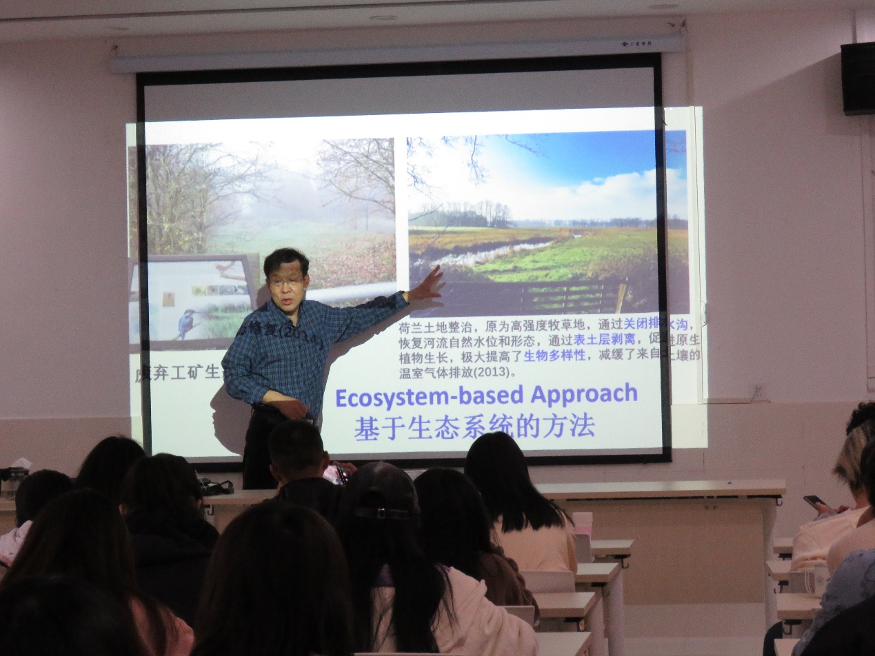 宇教授基于我院农村区域发展专业方向,基于国土空间规划的概念,讲述了国土空间生态修复的方式,并强调了牢固树立山水林田湖草是生命共同体的概念。宇教授强调我国需要构建参照生态系统,利用农业生态学原理提高生态环境的韧性和弹性,并防止千村一面的情况。为了让同学们理解“基于自然的解决方案”,宇教授举了两个例子,一个是将水泥改成海绵体等渗水砖,一个是将笔直流向的河流更改成曲线流向,这可以减少水流速度,提供更多的生存栖息空间,这也是生态廊道的构建方式,以及种植野花带为害虫天敌提供生态廊道的方式。最后,宇教授鼓励区域专业的同学们,树立一个远大的目标,积极参与其中,拥有了目标就能有更多前进的动力,将生态修复这一概念推广出去,在乡村,保证生态廊道的构建,为传粉昆虫和害虫天敌提供栖息地和食物来源,将每个乡村的独特优势打造出来,成为一个旅游资源,乡村生态价值就可以转换为实际价值。