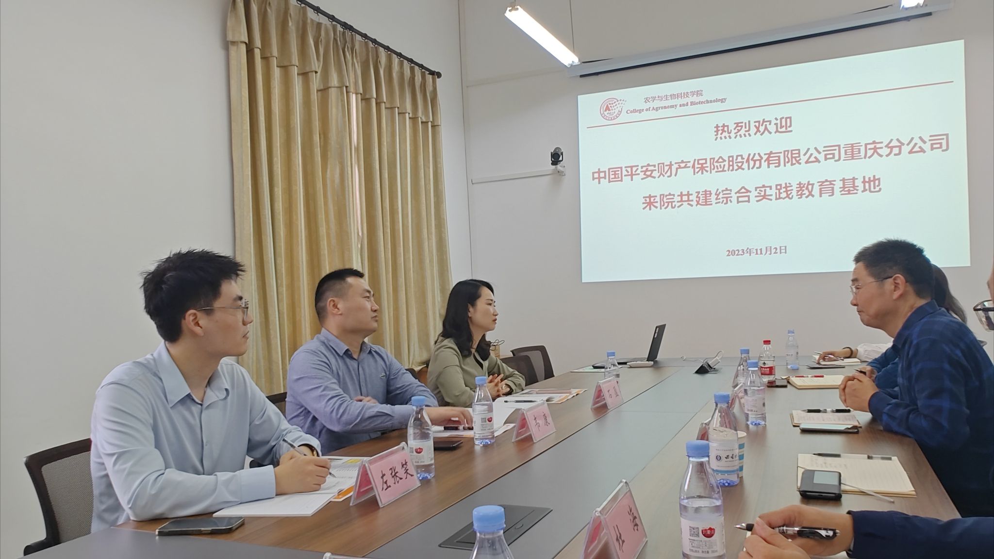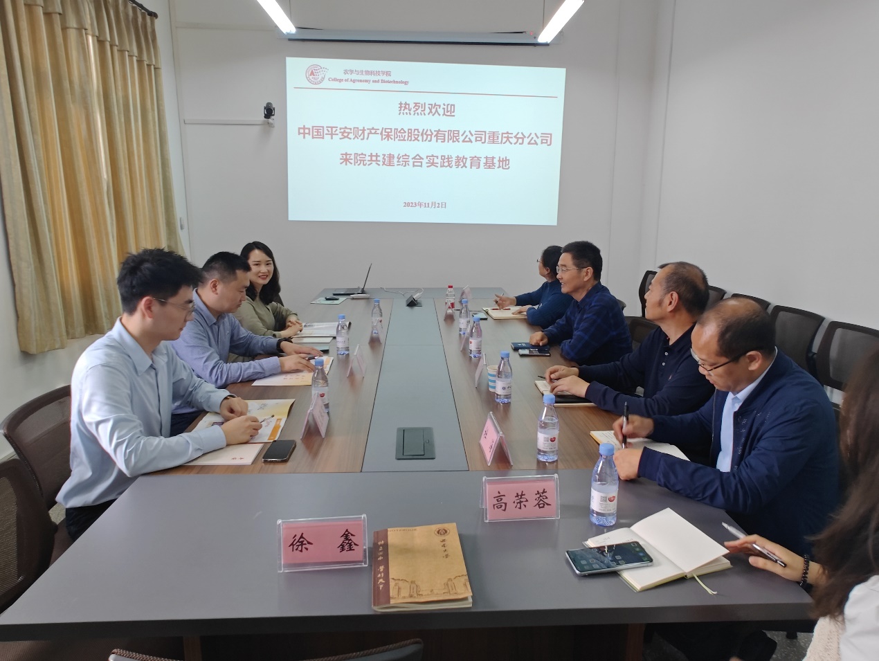 11月2日,中国平安财产保险股份有限公司重庆北碚支公司总经理韦康、中国平安财产保险股份有限公司重庆分公司人事部经理石盈、招聘部负责人左张笑到访学院,协商共建本科教学实习基地,协同培养农业保险人才。学院党委副书记郑莉佳、副院长张建奎、农学系主任桑贤春、植科系主任杜海、区域系副主任袁晓辉、教学办主任徐鑫和2021级辅导员高荣蓉参加座谈。会议由张建奎副院长主持。
