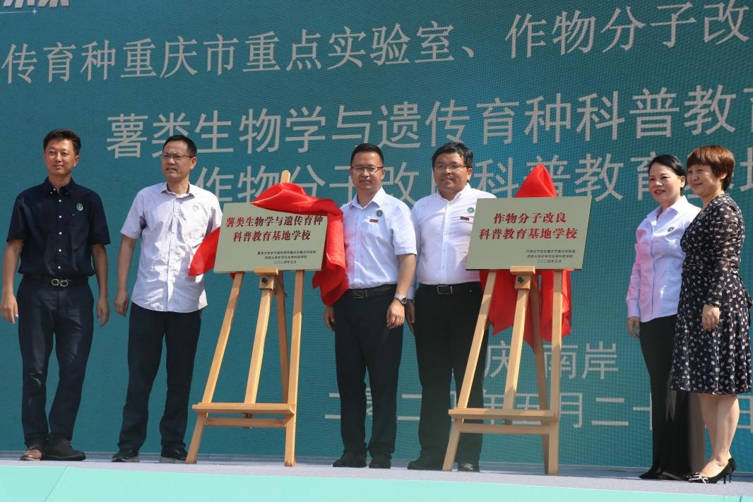 党委书记阳义健、院长吕典秋、副院长曲存民分别为“智慧农业驻点指导基地学校”“大学生社会实践基地学校”“薯类生物学与遗传育种科普教育基地学校”和“作物分子改良科普教育基地学校”揭牌。