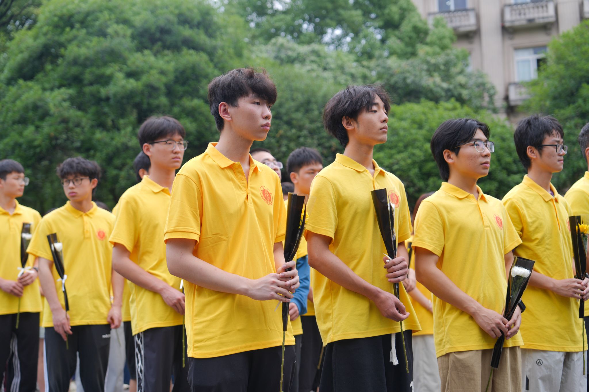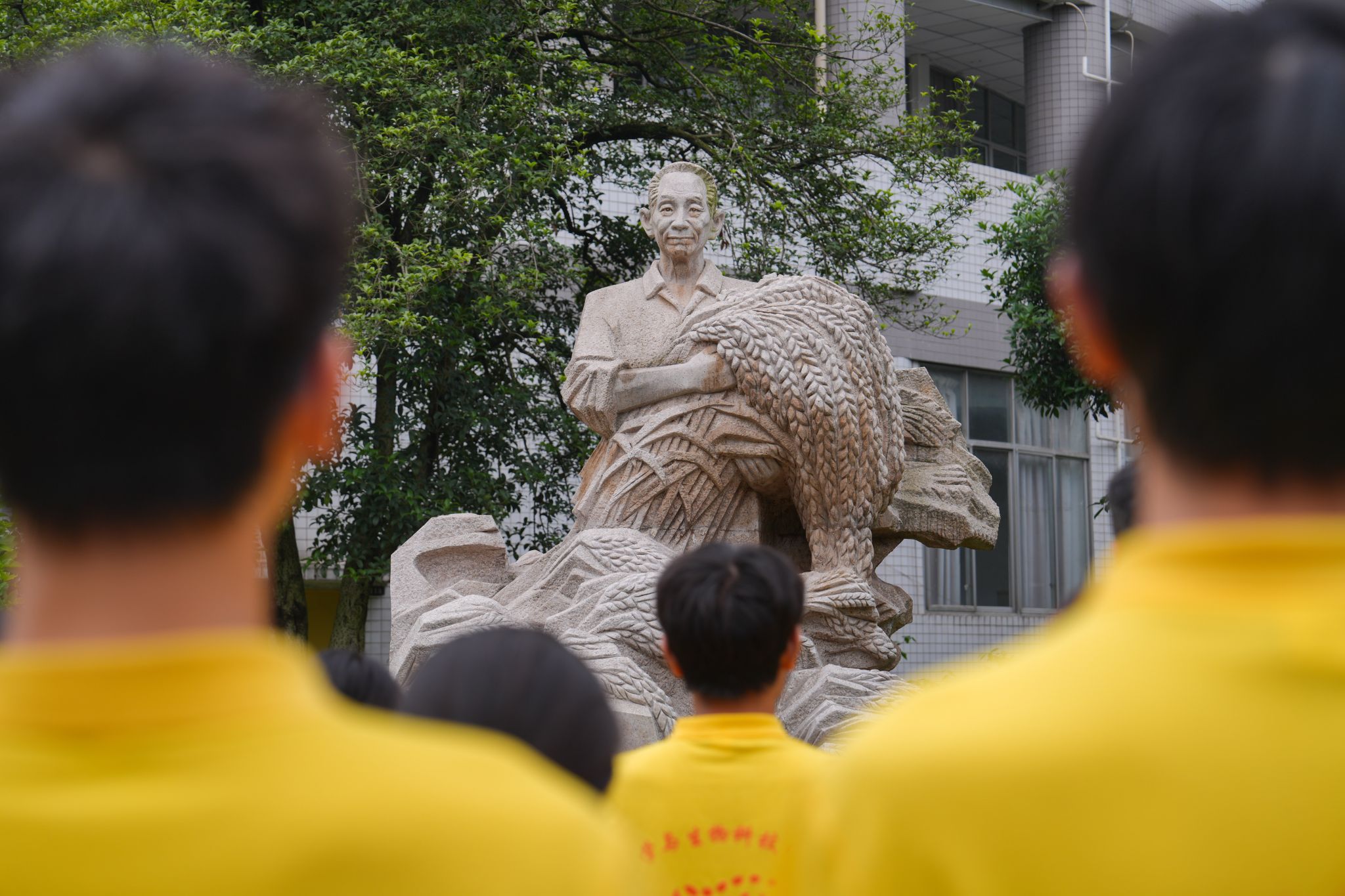 32教学楼前的袁隆平雕像处敬献鲜花、深切缅怀。edddh