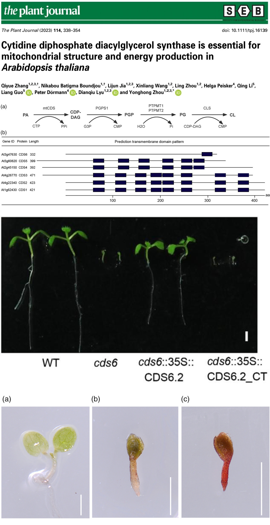 胞苷二磷酸二酰基甘油(CDP-DAG)是原核生物和真核生物中甘油磷酸脂生物合成的重要中间体。在不同细胞器中,CDP-DAG合酶(CDS)可催化合成特定的阴性磷酸甘油脂。前人的研究表明拟南芥CDS是膜内在蛋白,由一个小家族基因(被命名为CDS1-CDS5)编码。其中,CDS1、CDS2和CDS3位于内质网,CDS4和CDS5位于质体。然而,线粒体作为另一个脂质合成的场所,它所需的CDP-DAG的生物合成仍有待研究。该研究鉴定了一个线粒体特异性CDS蛋白,并命名为CDS6,进一步研究发现CDS6对于PG和CL在线粒体中的生物合成是必不可少的,这对线粒体内膜结构建成、TAG降解、能量代谢和幼苗发育至关重要。该研究以“Cytidine diphosphate diacylglycerol synthase is essential for mitochondrial structure and energy production in Arabidopsis thaliana”为题近期发表在生物学一区杂志《The Plant Journal》上,IF2022=7.091。2019级植物科学与技术专业本科生张琦玥为本文的第一作者,已毕业国际硕士研究生Nikabou Batigma Boundjou为共同第一作者,指导老师周永洪副教授为通讯作者。该论文受到了国家重点研发计划项目(2018YFE0127900)、中央高校基本科研业务费专项资金(SWU118109)、科技部科技合作计划项目(KY201904016)、edddh