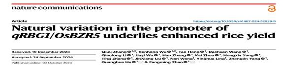 赵芳明教授为该研究的通讯作者,何光华教授为共同通讯作者,张秋丽博士为第一作者,吴仁鸿讲师为共同第一作者。本研究由国家自然科学基金、国家地区联合基金及科技创新重大项目等资助。参考文献或相关阅读:Zhang Q, Wu R, Hong T, Wang D, Li Q, Wu J, Zhang H, Zhou K, Yang H, Zhang T, Liu J, Wang N, Ling Y, Yang Z, He G, Zhao F. Natural variation in the promoter of qRBG1/OsBZR5 underlies enhanced rice yield. Nat Commun, 15,8565 (2024). //doi.org/10.1038/s41467-024-52928-9