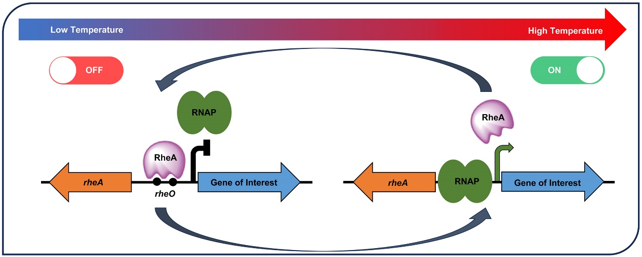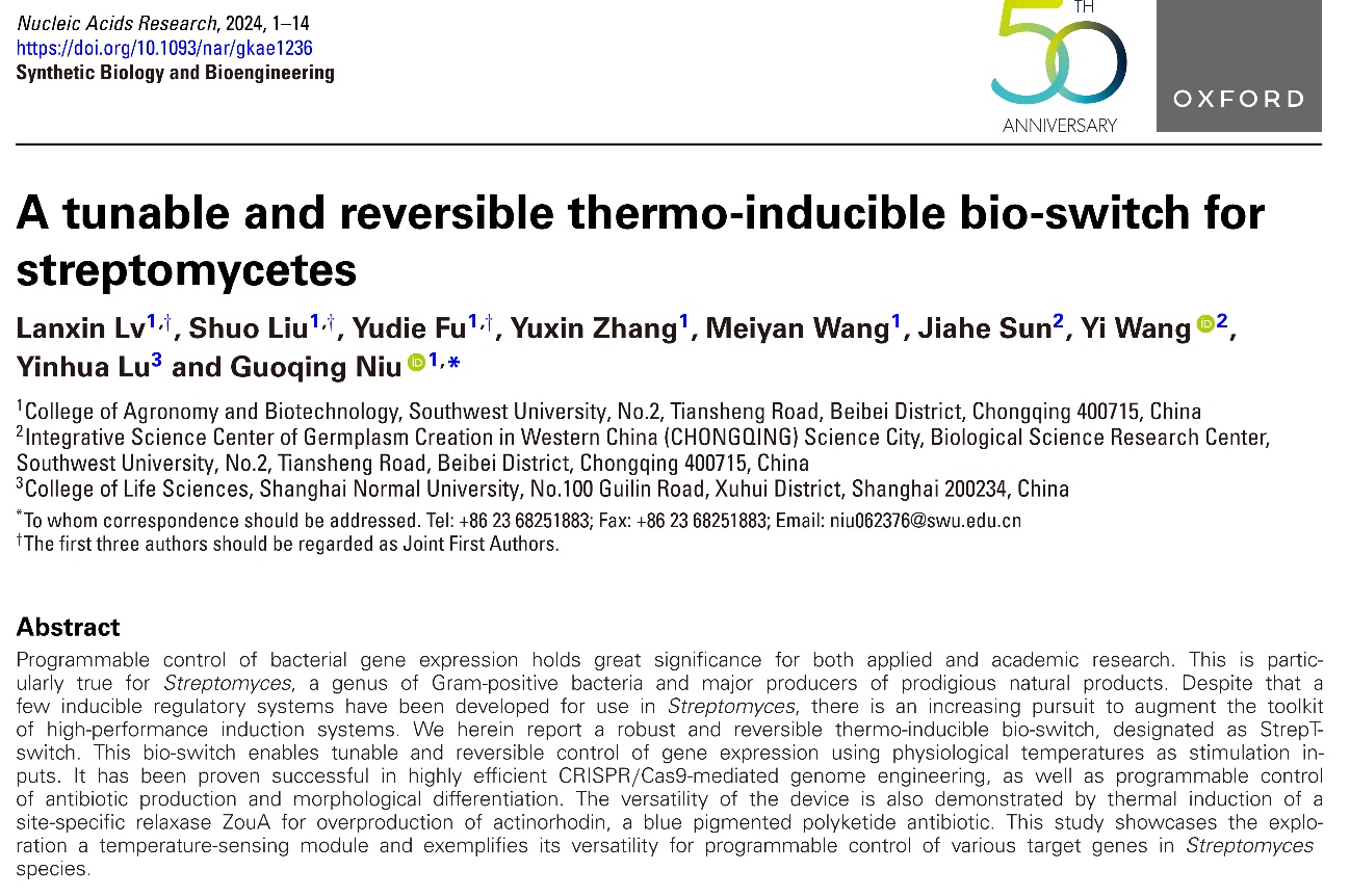 基因表达的精确调控是代谢工程与合成生物学的核心技术之一,是实现高值化合物在微生物细胞工厂中“智造”的重要手段。链霉菌是一类具有重要经济价值的革兰氏阳性细菌,具有产生多种生物活性天然产物的能力,在生物医药、农业等领域应用广泛。然而,链霉菌的基因表达调控复杂,经过几十年的研究,仅有少数几个基因诱导表达系统可供选择,且这些诱导表达系统存在一定的局限性,如高渗漏表达、诱导剂毒性、诱导剂易降解和不可逆性等问题。针对这些难题,牛国清研究员团队先后利用合成生物技术开发了两套链霉菌诱导表达系统:纤维二糖诱导表达系统(ACS Synthetic Biology 2021)和鼠李糖诱导表达系统(ACS Synthetic Biology 2024)。这两套诱导表达系统解决了高渗漏表达和诱导剂毒性问题,但诱导剂可被当作碳源利用,且添加纤维二糖或鼠李糖后的诱导过程是不可逆的。近日,牛国清研究员团队在链霉菌基因表达调控领域取得新进展,相关研究论文 “A tunable and reversible thermo-inducible bio-switch for streptomyces” 于国际知名学术期刊《Nucleic Acids Research》(《核酸研究》)正式发表。该研究成功构建了一种基于温度感应调控因子 RheA 的新型温度诱导基因表达调控系统(StrepT-switch),为链霉菌的基因工程改造及天然产物合成研究开辟了新路径。