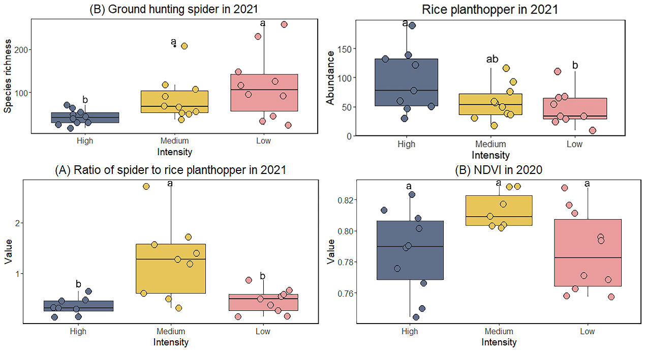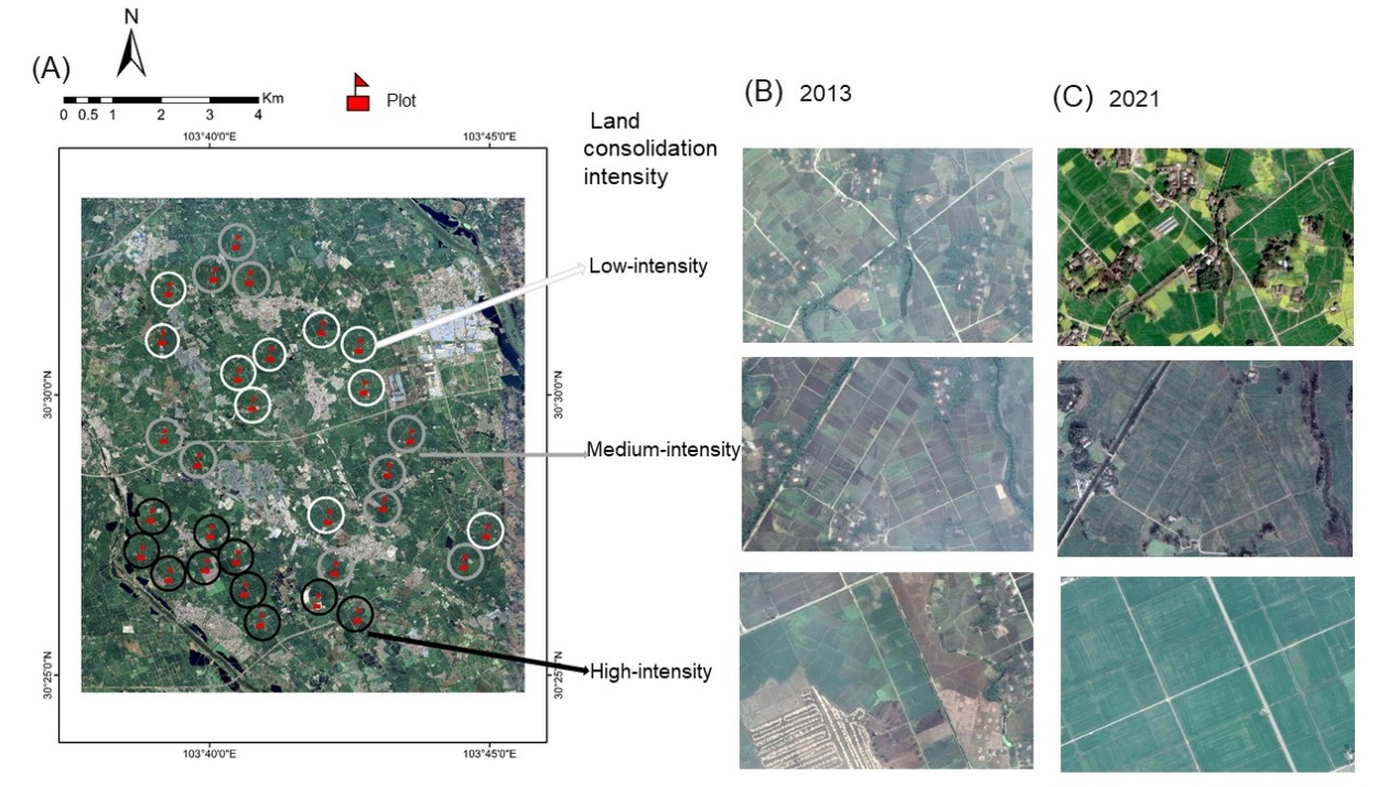 土地整理虽然有利于提高机械生产效率,减少农业生产成本,保障粮食安全,但是会对生物多样性产生一定程度的负面影响。在土地整理过程中保障粮食生产的同时实现生物多样性保护具有重要意义。本研究在成都平原西部对高、中、低三种整理强度下各10块半径500米的稻田景观进行整理前后(2013年 VS 2021年)的景观变化分析,同时对比不同整理强度下鸟类、蜘蛛、步甲、植物和稻飞虱多样性以及稻田NDVI值差异。高强度的土地整理措施包括林地开垦,田块的大规模合并和住宅区的迁移和集中安置等;中等整理强度景观主要进行田块合并;低整理强度的景观仅种植大户对部分相邻的小面积田块进行合并,未进行政府主导的土地整理。
