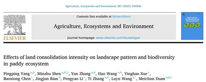 近日 Elsevier旗下知名期刊Agriculture, Ecosystems and Environment(中科院SCI期刊分区农林科学大类1区Top)在线发表了我院段美春课题组关于土地整理强度对稻田生物多样性影响的研究成果。