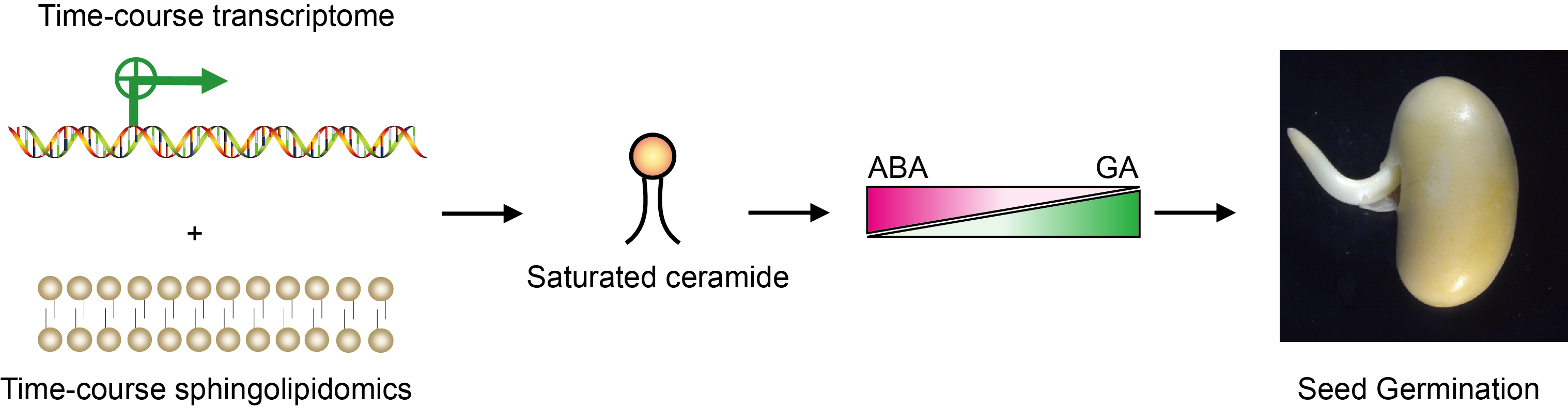 近日崖州湾种子实验室主办的学术期刊 Seed Biology 在线发表了我院大豆团队题为“Saturated ceramide is required for seed germination in soybean”(//doi.org/10.48130/seedbio-0025-0006)的研究论文。该研究通过整合时序转录组分析、鞘脂组学数据以及遗传学证据,揭示了简单饱和鞘脂通过调控种子中赤霉素(GA)与脱落酸(ABA)的比率,从而促进大豆种子萌发的分子机制。