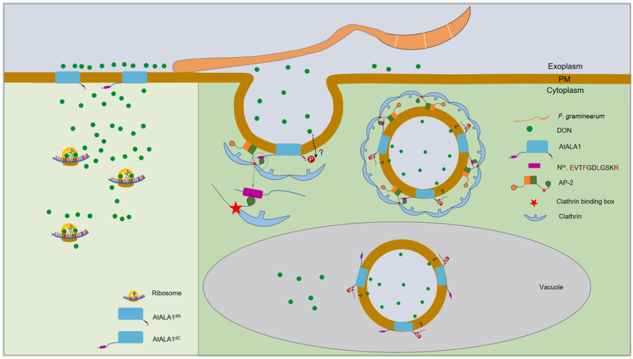 赤霉病(FHB)是一种严重威胁禾谷类作物的毁灭性病害,主要由禾谷镰刀菌(Fusarium graminearum)引起。该病原菌产生的B型单端孢霉烯族毒素-脱氧雪腐镰刀菌烯醇(DON)不仅是重要的致病因子,更是污染谷物、威胁全球食品安全的重要因素之一。前期研究发现,AtALA1介导的囊泡运输能够将DON包裹在囊泡中,并通过囊泡运输途径将其转运至液泡,从实现细胞解毒(Wang et al,. Nat Commun, 2021)。