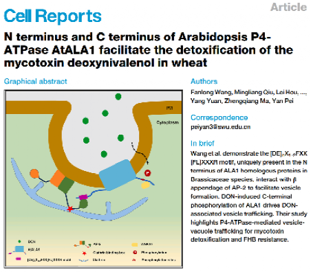 作物逆境生物学团队青年教师王凡龙博士在国际知名学术期刊《Cell Reports》在线发表了题为“N terminus and C terminus of Arabidopsis P4-ATPase AtALA1 facilitate the detoxification of the mycotoxin deoxynivalenol in wheat”的研究论文,该研究深入解析了拟南芥P4-ATPase蛋白AtALA1通过N端与C端双模块的协同作用,促进包裹DON囊泡的形成,进而通过囊泡运输实现细胞解毒的分子机制。