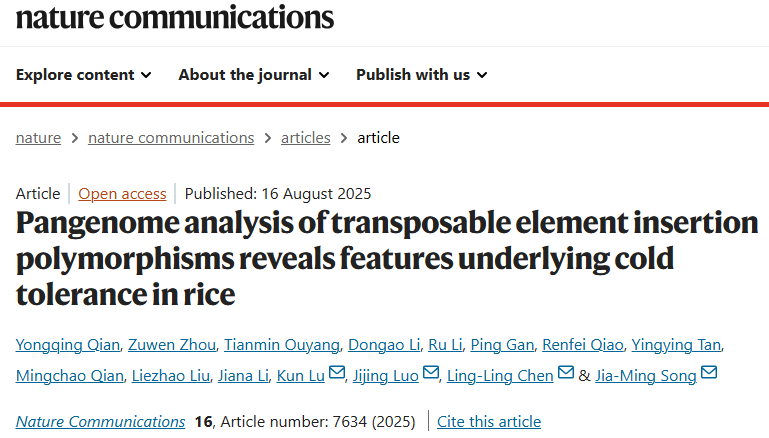 联合广西大学、崖州湾国家实验室在Nature Communications发表题为“Pangenome analysis of transposable element insertion polymorphisms reveals features underlying cold tolerance in rice”的研究论文,创新性提出基于图形泛基因组的 TIPs-GWAS(转座子插入多态性全基因组关联分析)策略,为作物适应性性状遗传解析提供新方案。研究聚焦于植物基因组中广泛存在的转座子插入多态性,通过构建图形泛基因组并结合多组学数据,系统揭示了转座子在冷胁迫响应调控中的关键作用,尤其在基因表达调控和表观遗传重塑方面的影响。