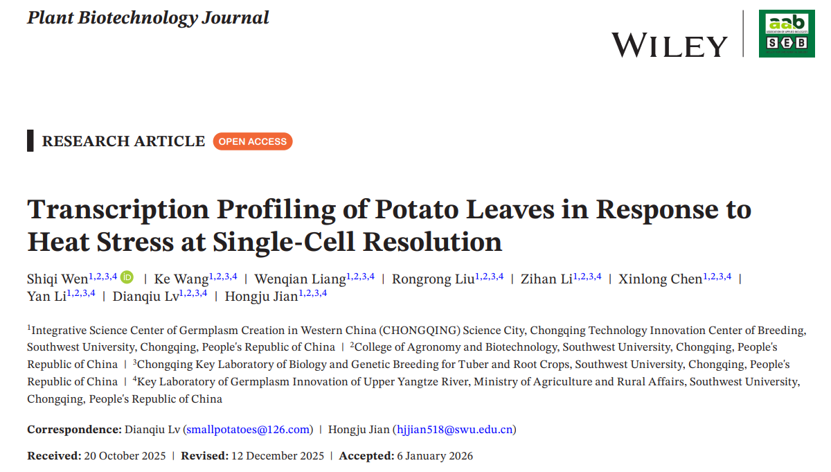 吕典秋课题组在Plant Biotechnology Journal上发表题为Transcription profiling of potato leaves in response to heat stress at single-cell resolution的研究论文。该研究首次在单细胞水平解析了马铃薯细胞对热胁迫的特异性响应机制,绘制了一个包含超过77,000个有效细胞的单细胞时空转录图谱,构建了细胞类型特异性响应高温的转录调控网络,揭示了热胁迫下植物叶片的细胞异质性和分化轨迹,鉴定了马铃薯叶片对热胁迫响应的关键核心基因,发现表皮细胞是应对热胁迫的关键细胞群,为培育耐高温马铃薯种质提供了新的策略和靶点。