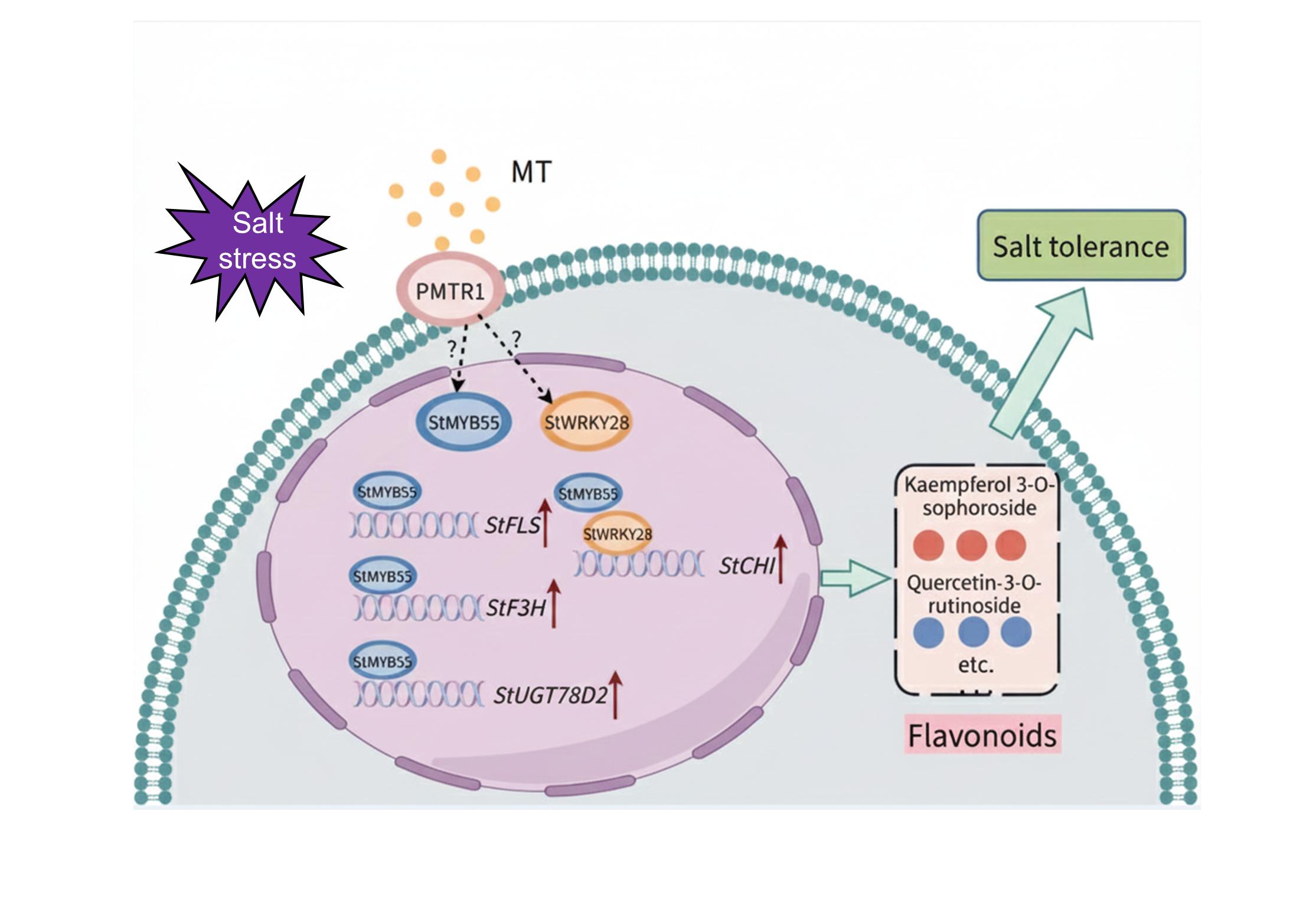 马铃薯是全球重要的粮食作物,盐胁迫严重制约其生长发育和产量形成。褪黑素作为一种多功能信号分子,在植物逆境响应中发挥重要作用,但其在马铃薯耐盐性中的具体调控机制尚不明确。本研究发现,适宜浓度的褪黑素(10 μM)处理可显著缓解马铃薯的盐胁迫损伤。通过转录组与代谢组联合分析,筛选出响应盐胁迫和褪黑素处理的核心转录因子StMYB55和StWRKY28,二者均在盐胁迫下被显著诱导表达。功能研究表明,过表达StMYB55可通过促进类黄酮积累显著增强转基因马铃薯的耐盐性。机制解析发现,StMYB55直接激活类黄酮合成关键基因StF3H、StFLS和StUGT78D2的转录,而StWRKY28则直接调控StCHI的表达。StMYB55与StWRKY28发生蛋白互作,协同增强StWRKY28对StCHI的转录激活作用,共同促进类黄酮的生物合成。该研究首次揭示了褪黑素介导的StMYB55-StWRKY28转录复合物模块在调控类黄酮积累和耐盐性中的关键作用,为褪黑素信号转导网络的研究提供了新的理论依据。