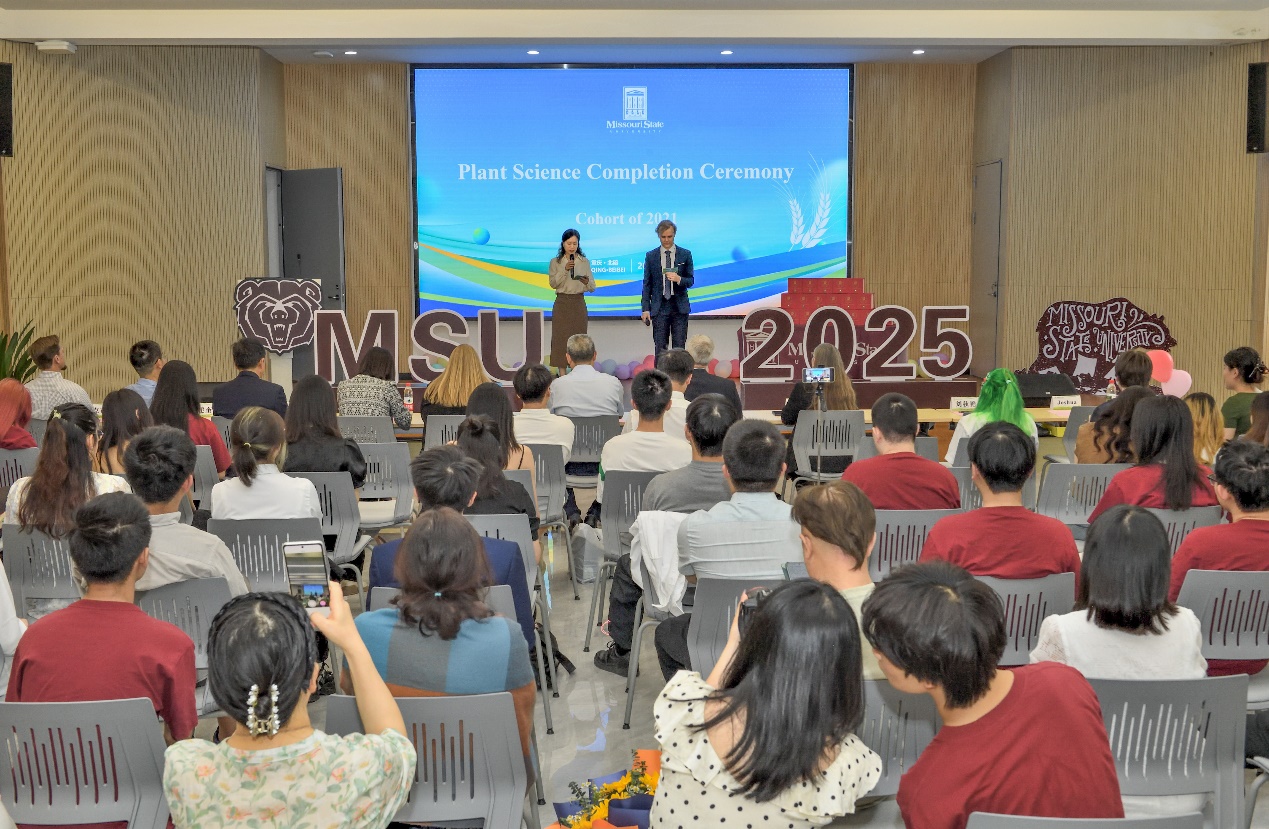 5月24日下午, MSU植科2025届结业典礼在南区招聘大厅隆重举行。出席本次结业典礼的嘉宾有密苏里州立大学(MSU)副校长布莱德・博登豪森先生,MSU国际处中国项目办公室主任刘丹丹女士,MSU农学院院长梅丽莎・布莱德索博士,MSU农业科学与保护学系系主任莱西・苏科瓦蒂博士,MSU杰出教授、葡萄生物技术中心主任邱文平,MSU农业科学与保护系讲师雅克布・施奈德,MSU英语系讲师约书亚,edddh