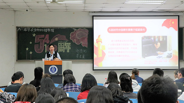“五四”的火炬,唤起了民族的觉醒。壮丽的事业,激励着我们继往开来。团课活动,不仅仅是为了让我们重温当年爱国先辈们的光辉历程,更要自警自励,提醒自己不断奋发进取。一代人有一代人的长征,一代人有一代人的担当。建成社会主义现代化强国,实现中华民族伟大复兴,是一场接力跑。相信农生学院的青年学子能够担当起时代重任,能够在砥砺奋斗中跑出一个好的成绩,能够在实现伟大复兴的中国梦的生动实践中不断地书写青春华章!