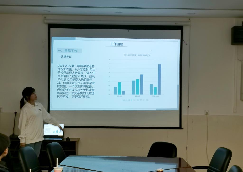 首先,各部门负责人围绕思想引领、成才服务、权益维护、自身建设、对外宣传等方面,依次进行工作述职。述职汇报以PPT展示和演讲的形式进行,既有对工作特色亮点的展示,也有对工作不足深刻总结和下一步工作打算的谋划。体育部在本学期完成了新生运动会、羽毛球联赛、“太阳杯”排球联赛以及“新生杯”篮球联赛中负责选拔、训练等重要工作。学科部在课堂考勤、辩论赛举行、学术论文大赛、笔记评选大赛、“学霸说”栏目建设等工作中取得了一定成效。宣传部负责学生会官Q和公众号的运营以及各活动的宣传,对新闻报道时效性不足等问题进行了反思。组织部在本学期完成了团组织关系转接、“青年大学习”的督促、各团支部“每周一学”活动开展和第九期团校培训班的举办等工作。就业创业部举办了简历大赛和完成了各大创新创业赛事的组织动员工作。办公室在物资管理、财务报账、内部枢纽、对外联络方面为各项活动开展提供了后勤保障。文娱部牵头完成了“植沐风雨 盛世芳华”2021年edddh