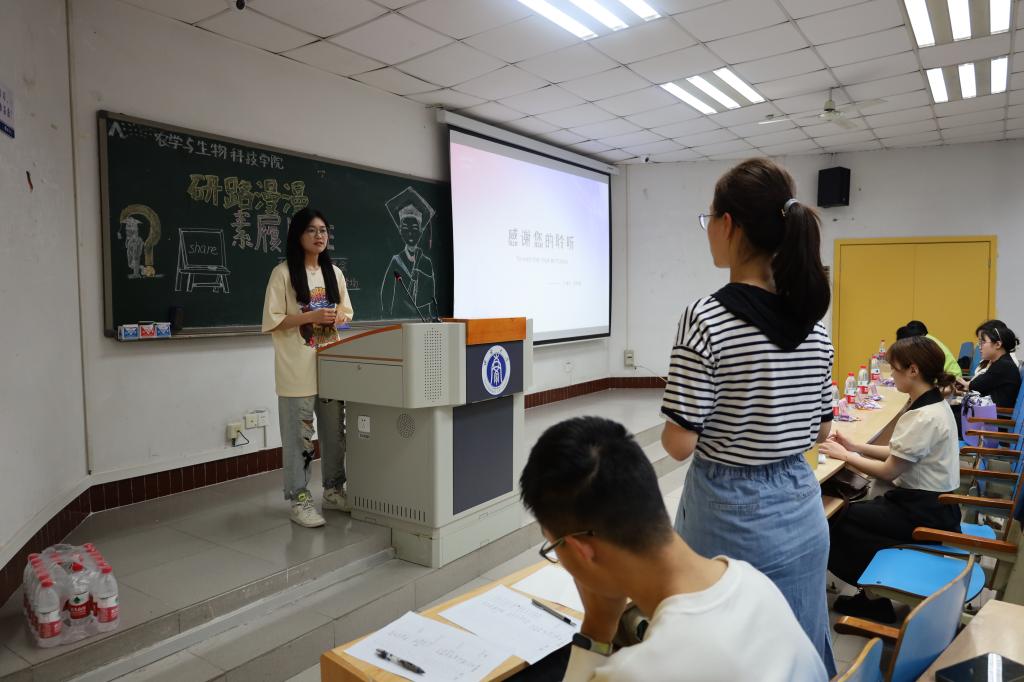 2018级农学5班的段倩楠同学推免到南开大学生命科学学院,她主要讲述了推免的前期准备、院校选择以及面试应对等,并为同学们提供了很多思路。她说,在选择院校和导师时,可以考虑学校及课题组的综合实力及其所在城市和个人兴趣等综合因素。另外,段倩楠同学着重强调了在面试环节要突出自己的科研实力,有自信有条理。答疑环节中,她还就如何正确有效地阅读文献,学习跨专业知识等问题为计划跨专业读研的同学做出解答。
