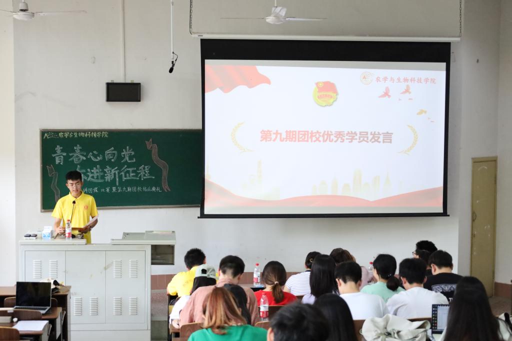 在团校结业典礼上,同学们还一同学习了《焦点访谈》专题视频《奋斗者 正青春 培根铸魂肩使命》,回顾了习近平总书记对广大青年的殷殷嘱托,同学们感悟到作为当代青年要树立社会主义核心价值观,要勤学习、明大德、立大志,才能成大才、担大任。青春由磨砺而出彩,人生因奋斗而升华。开展了学习习近平总书记在庆祝中国共产主义青年团成立100周年大会上的重要讲话精神学习交流会,师生们分享了自己的学习感悟。团委书记助理陶家阳说道,中国青年应当志存高远,有坚定的理想信念和清晰的思辨精神,这样才能在理想和现实、主义和问题、小我和大我、民族和世界等问题上做出正确的抉择和判断。2021级团员王媛媛也从自身学习、工作分享了习近平总书记的讲话带给她的启发和思考,作为农生学子,要以强农兴农为己任,瞄准国家战略需求,厚植“知农爱农”情怀,敢做农业现代化的领跑者,为国家的“三农”事业贡献青春力量,不负时代,不负党的引领号召,践行青年团员的使命担当。习近平总书记在讲话中提出“实现中国梦是一场历史接力赛,当代青年要在实现民族复兴的赛道上奋勇争先”,许莹竹老师勉励同学们说,在人生中会我们会进入到不同的赛道,要在每个赛道上的每个环节都不懈努力,要有理想、敢担当、能吃苦、肯奋斗,用青春的量为党和人民的事业做贡献。许老师还结合学院老师们的先进事迹,鼓舞农科学子们要在青春的赛道上跑出最好的成绩!