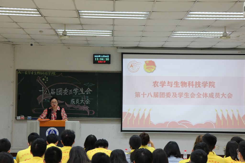 会议第四项,办公室工作人员王铧同学代表团委学生会新成员发言,他激昂地代表了加入团委及学生会团队喜悦与兴奋,、共同做好工作的信心与决心,并积极表态,谨记杰出校友直系学长袁隆平先生的寄语,践行学院“追梦求实”院训,做到脚踏实地干事,努拼搏向未来,在学生组织中积极服务同学、锻炼自我,书写多彩青春。