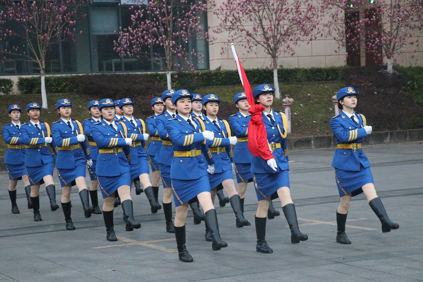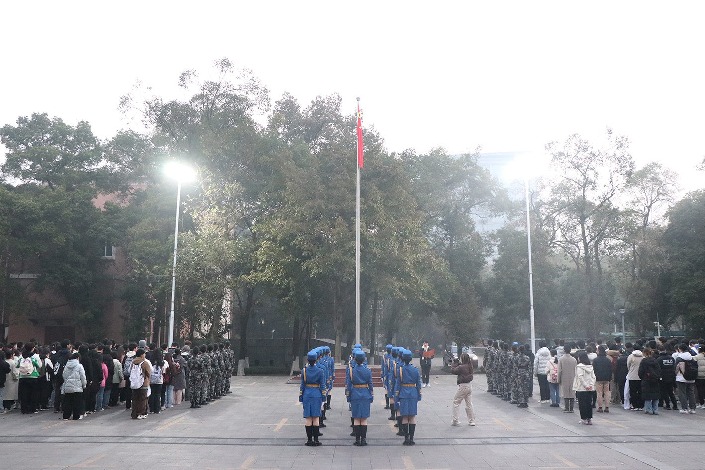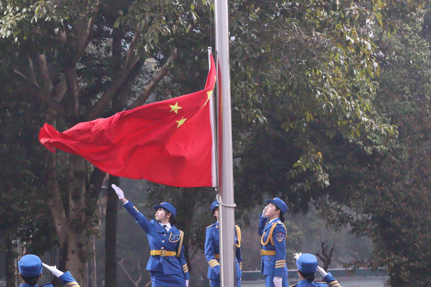 女子国旗班成员迈着整齐划一、铿锵有力的步伐,护送着五星红旗正步走向旗杆。伴随雄壮激昂的《义勇军进行曲》,五星红旗冉冉升起,全体师生高唱国歌,向国旗行注目礼。