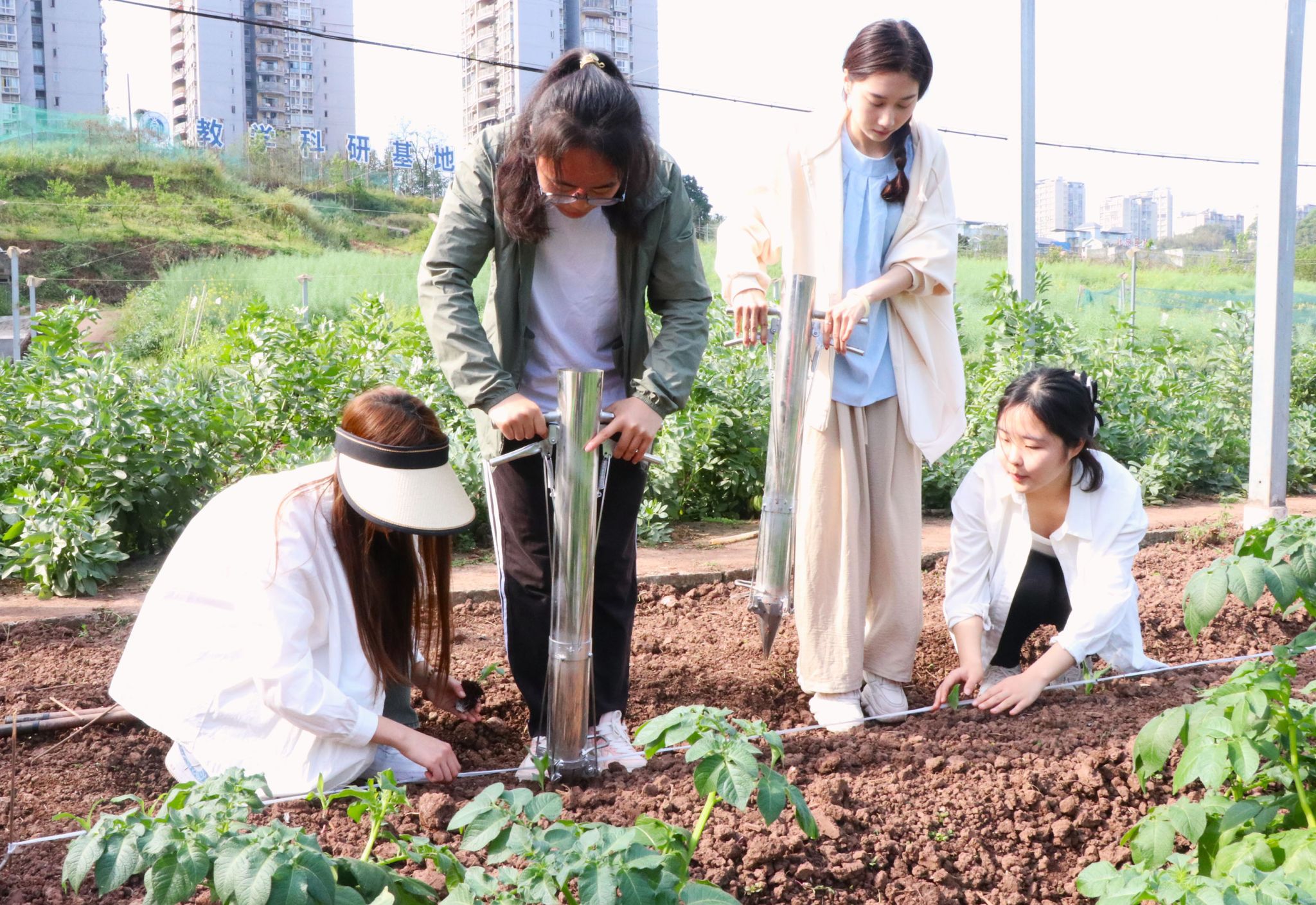 随后,同学们分组协作,开始实践操作。体验者和农学专业同学分组结对,相互配合,井然有序。他们先利用线绳和测量工具进行了精确的测距挖窝工作,确保玉米的根系发展和营养吸收有合理的空间。接下来,进入移栽环节,体验者们在农学专业同学的指导下,小心翼翼地将幼苗从育苗盘中取出,利用栽苗器移植到已经挖好的窝中。然后,大家按照先前计算的玉米需肥量,进行施肥和浇水操作,保障玉米后续生长有充足养分水分。移栽现场同学们热情饱满,认真投入。经过一个多小时的辛勤劳作,一行行玉米苗整齐地在田间昂首挺立,焕发出勃勃生机。