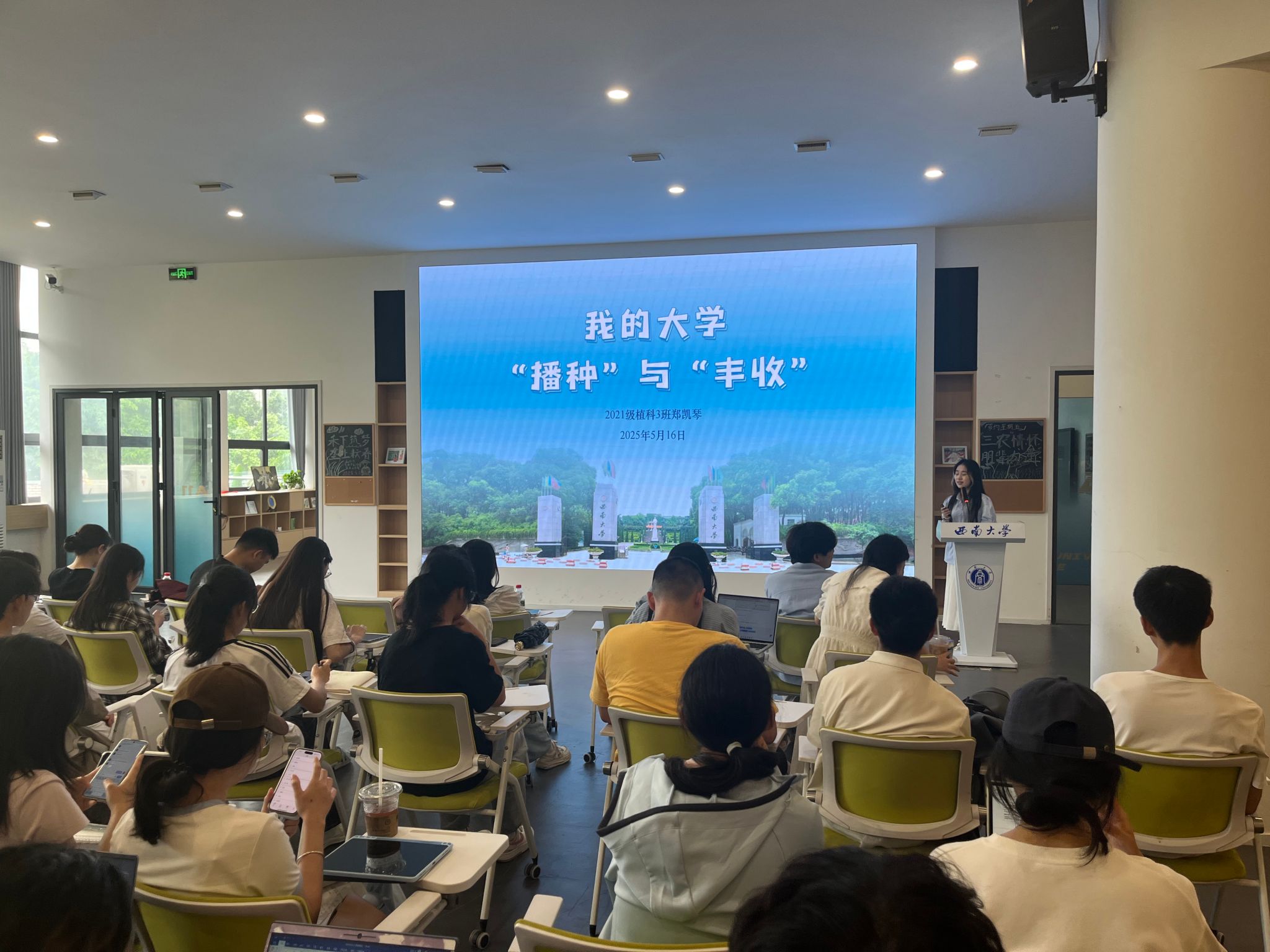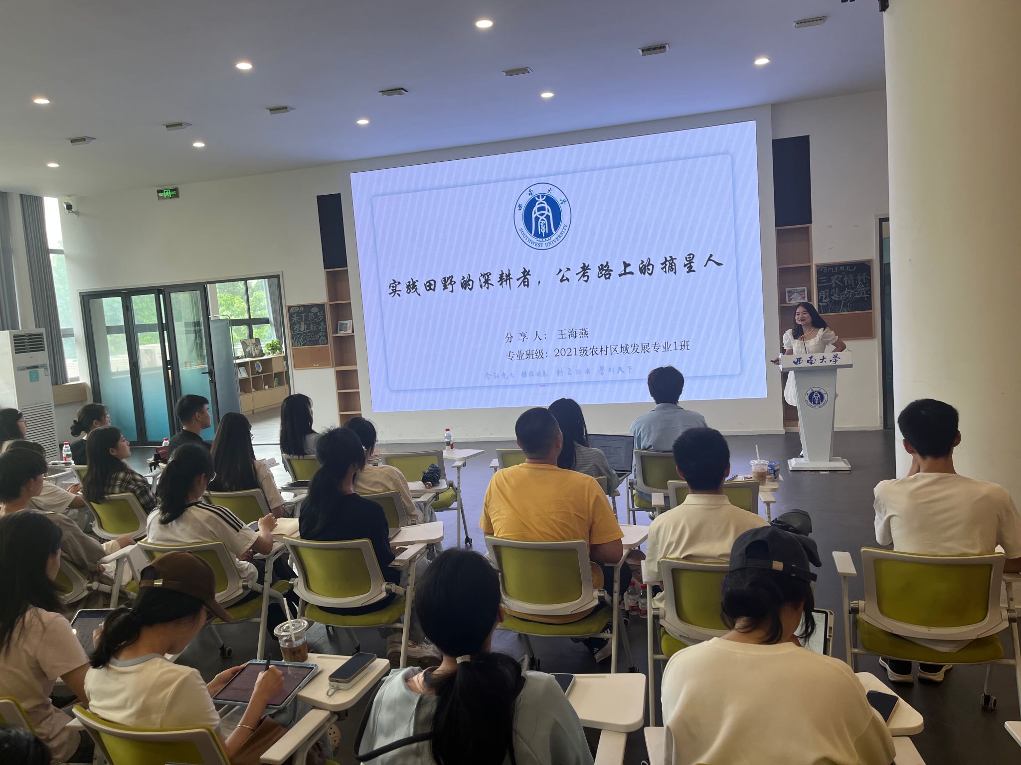 考上四川急需紧缺选调生的2021级农村区域发展专业本科生王海燕以“实践田野的深耕者,公考路上的摘星人”为主题,构建起“理论学习—职业规划—实践赋能—跨界突破”的立体化成长坐标系,为农科学子展现多元发展的无限可能。王海燕同学通过分享在重庆市乡村振兴局的实习经历与备考公务员的技巧,指出“在乡村振兴与科技赋能的交叉领域,农科背景正转化为独特的竞争优势”。她鼓励同学们打破“专业对口”传统认知,通过实习实践、政策研学等多元路径,在学科交叉地带寻找职业突破口,真正成为“懂农业、爱农村、爱农民”的复合型人才。