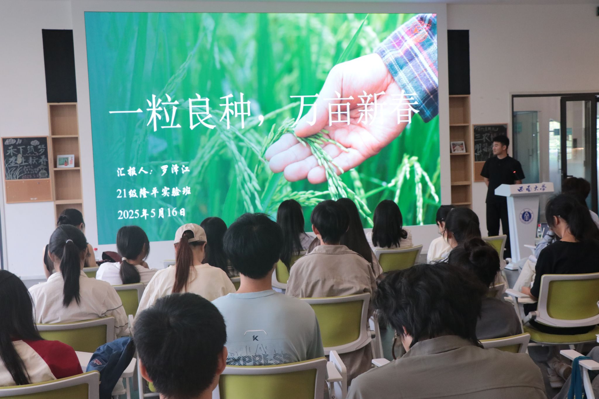 一粒良种,万亩新春。2021级农学专业本科生罗泽江用具体详实的个人案例,讲述了自己大学四年的奋斗历程。他结合科研实践,剖析了农业现代化进程中的机遇,并指出“当智慧农业遇上乡村振兴,我们的专业知识正成为粮食安全的重要拼图”。最后,罗泽江同学鼓励学弟学妹们,要继承与发扬袁隆平院士敢为人先、勇攀高峰的科学家精神,在时代浪潮中找准自身定位,努力学习专业知识,为农业科技创新贡献青春力量。
