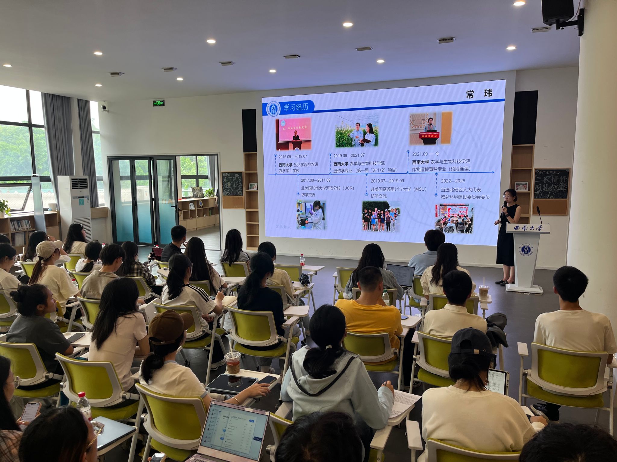 2021级作物遗传育种专业博士研究生常玮以“向下扎根,向上生长”为主题,分享了她在本硕博期间的科研经历和创制油菜优良品种时的趣事和难点。她锐意进取,实践创新,以第一或共一作者身份在《PlantPhysiology》等植物学Top期刊上发表7篇学术论文,以实际行动践行“把论文写在祖国的大地上”的承诺。常玮同学表示,“越接近土地,生命越有扎根的底气,学农也可以走出不一样的精彩人生”。她衷心希望同学们“要在学术追求与生活热爱间找到平衡,既要仰望星空,更要脚踏实地”。