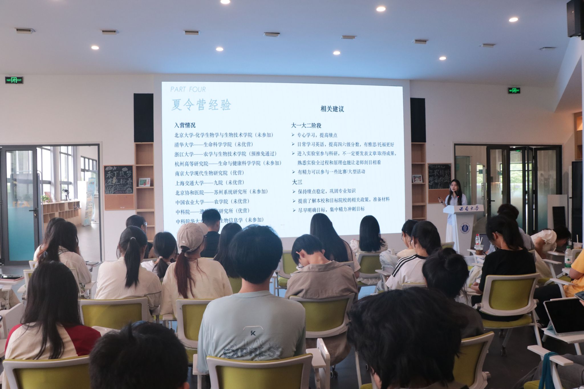 保研至浙江大学农业与生物技术学院的2021级植物科学与技术专业本科生郑凯琴以“大学生涯的‘播种’与‘丰收’”为主线,向同学们介绍了保送推免的成功经验与学习方法。郑凯琴同学通过分享大学不同阶段的学习重点、选择夏令营的思路、参加夏令营的经历,为同学们提供了全面且实用的经验参考。她指出,“保研不是终点,而是科研生涯的新起点,每个阶段都要清楚‘种什么’和‘怎么收’”,让在场的同学们收获颇丰。