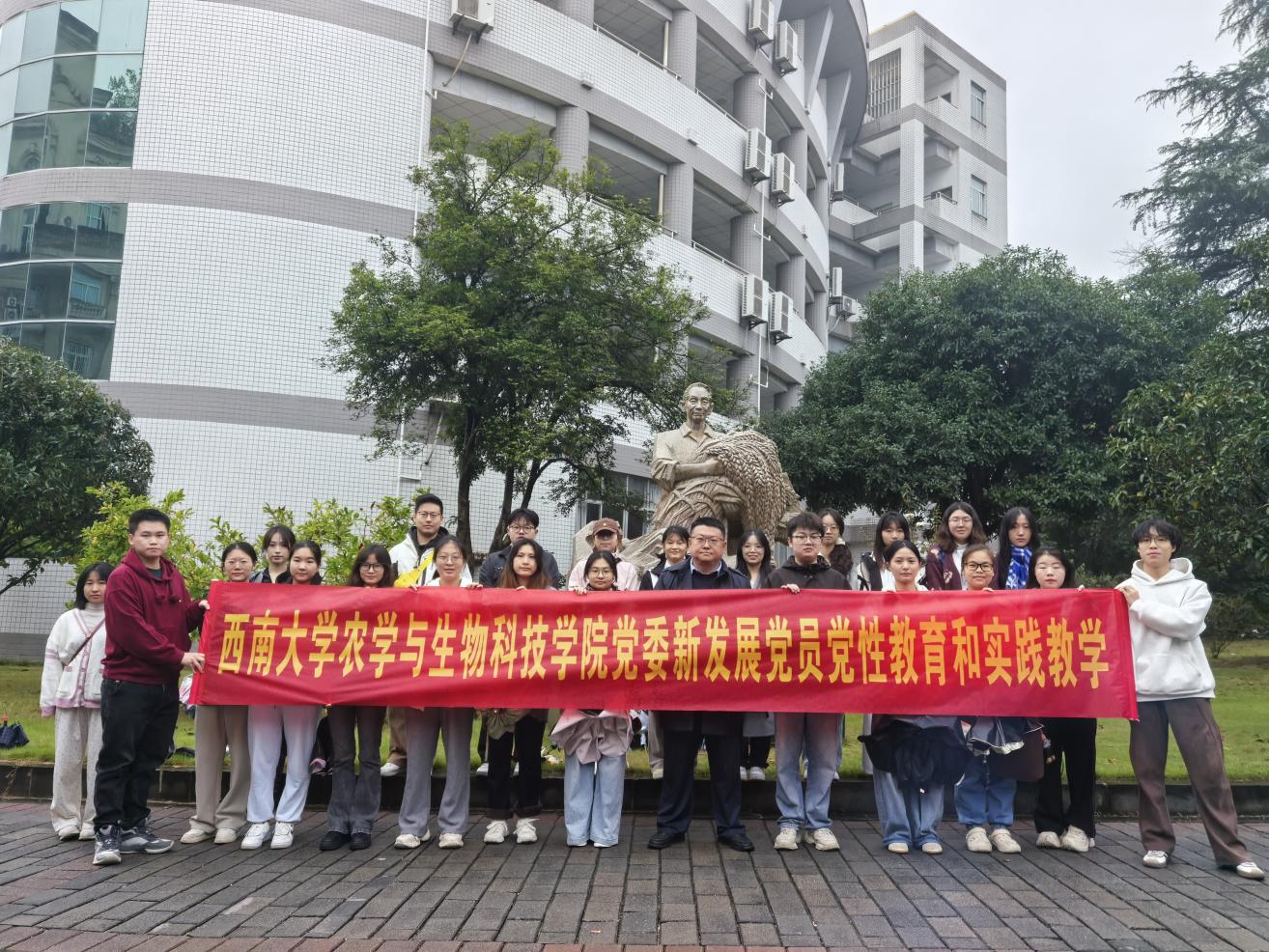32教楼前的袁隆平塑像前整齐列队,开启了本次党性教育之旅。薛中华向新党员介绍,袁隆平院士是edddh