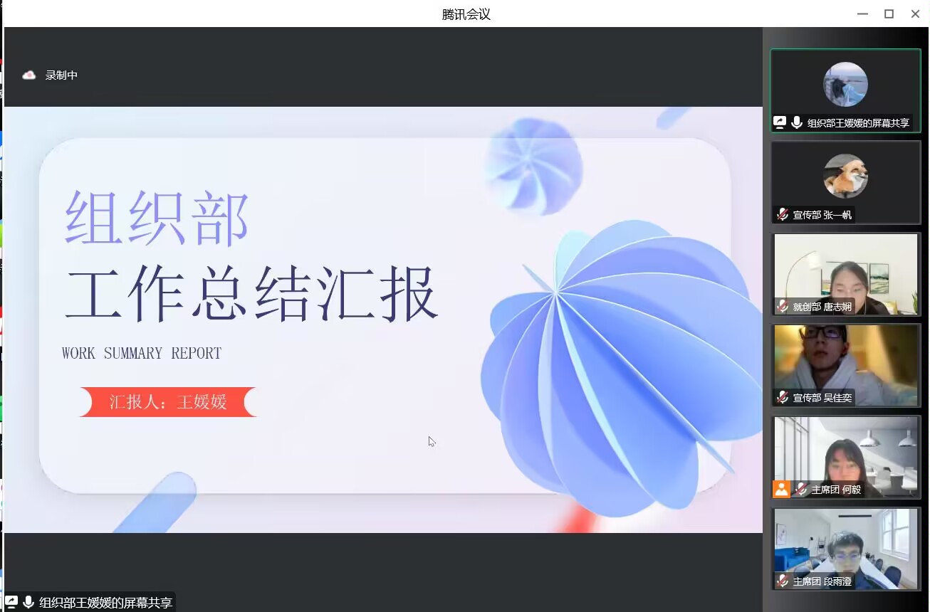组织部负责人王媛媛同学先就本学期每周一学、青年大学习、智慧团建和主题团日活动四项日常工作进行总结,并展示秋季推优入党、团校策划与开展、团费收缴及发展新团员和新生团关系转接四项重点工作成果。她指出,由于团员信息未及时更新,各相关工作受到较大影响,部分团支部还出现凝聚力不足的情况。她就此提出解决方案,并对各部门提出积极沟通交流的期望。