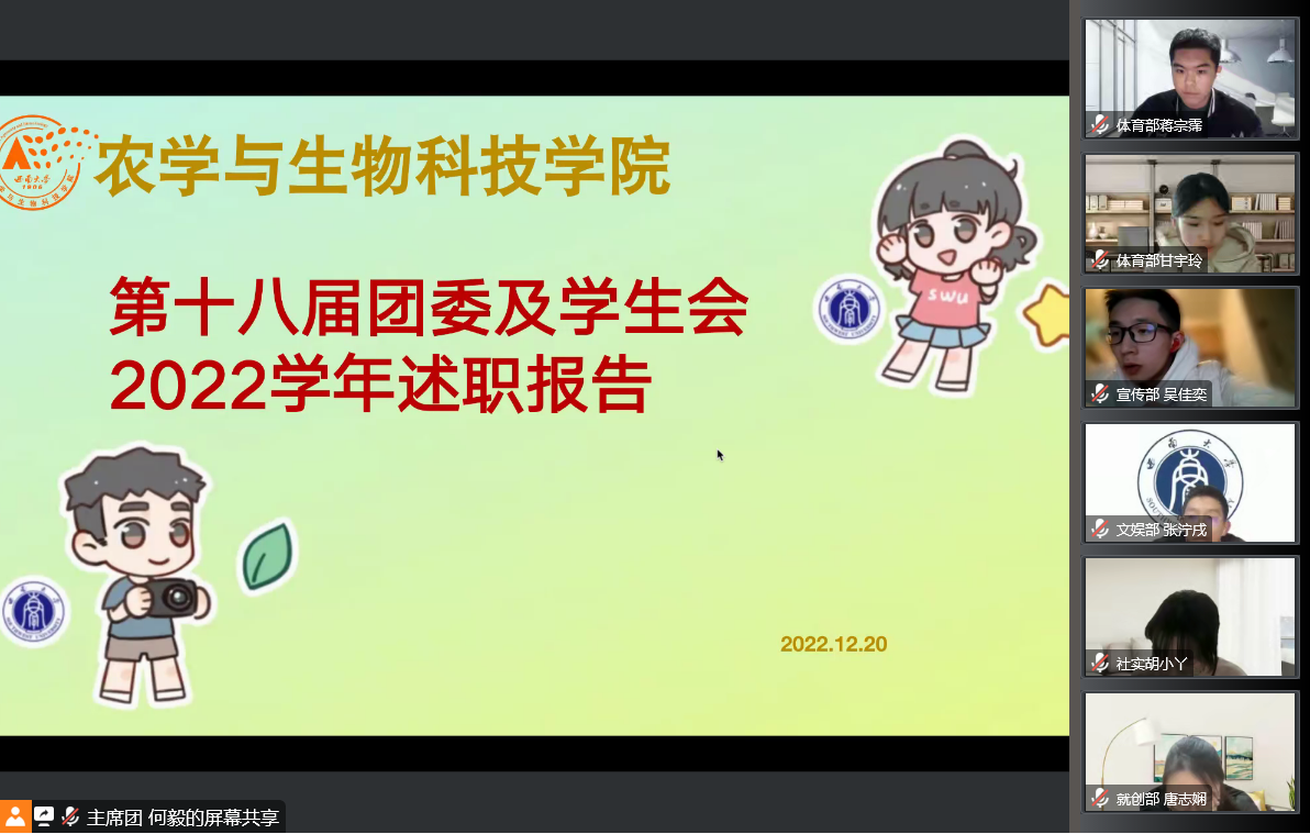 以腾讯会议形式于线上举行第十八届团委及学生会2022-2023学年秋季学期述职报告会。学院团委书记许莹竹老师出席会议,团委及学生会主席团成员、各部门负责人参会,会议由团委及学生会主席团成员何毅、段雨澄主持。各部门负责人代表制作ppt,利用图画、数据、文字等方式对本学期的部门工作进展和成效进行汇报,并对工作开展过程出现的问题进行总结反思。