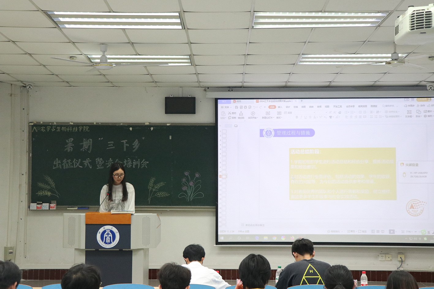 许莹竹老师首先做动员讲话,她指出大学生社会实践的重要意义,是要用脚步丈量大地,在实践中增长才干。她要求同学们一是要牢固树立安全意识,自觉树立良好形象,二是扎实开展服务,传承弘扬实践精神,三是聚焦专业背景,助力乡村振兴战略,四是不断完善自我,自觉主动锻炼成长。特别强调要切实落实安全措施,充分完善应急预案,在保障自身安全的前提下完成好实践任务。