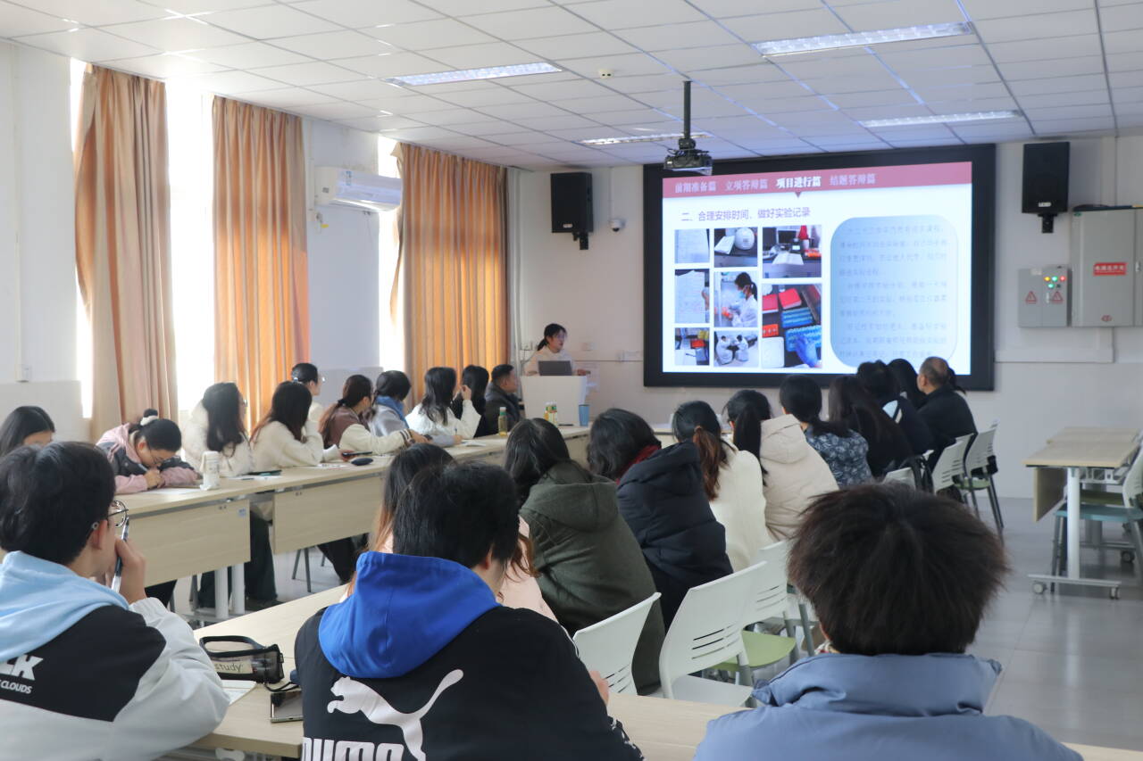 分享会上,三位学姐向同学们介绍了大创项目立项书的撰写技巧,以及从项目申报到结题的整个流程。杨潇然学姐着重从计划性和实验能力两个维度进行阐述,计划性体现在方向选择的精准性、时间安排的合理性以及书写规范的严谨性上;而实验能力则涵盖主动性、责任心以及总结归纳的能力。甘宇玲学姐则以时间为轴,为同学们介绍了大创项目的各个阶段。她提到,在项目前期准备阶段,同学们应提前进入实验室积累基础知识,积极与老师沟通以确定研究选题;立项答辩时需对项目内容了如指掌,表述清晰,预设可能遇到的答辩问题;在项目进行中,要明确目标,合理规划时间,并认真整理实验记录;而在结题答辩时,则要像讲故事一样,条理清晰地展示研究成果。此外,她还鼓励同学们将大创项目转化为参赛作品,以进一步提升项目的实用价值和影响力。