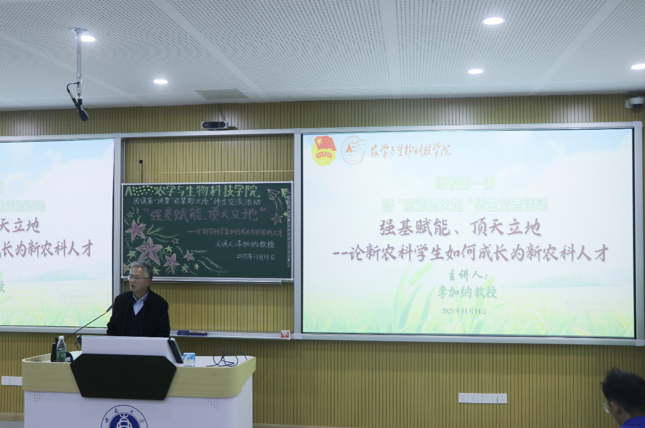 李加纳教授以“强基赋能,顶天立地——论新农科学生如何成长为新农科人才”为题给同学们做讲座。他首先带领同学们一起学习了习近平总书记给中国农业大学全体师生的回信,强调“知农爱农”的切实要求,鼓励新农科学生要努力成长为新农科人才为建设农业强国、推进中国式现代化做出新贡献。
