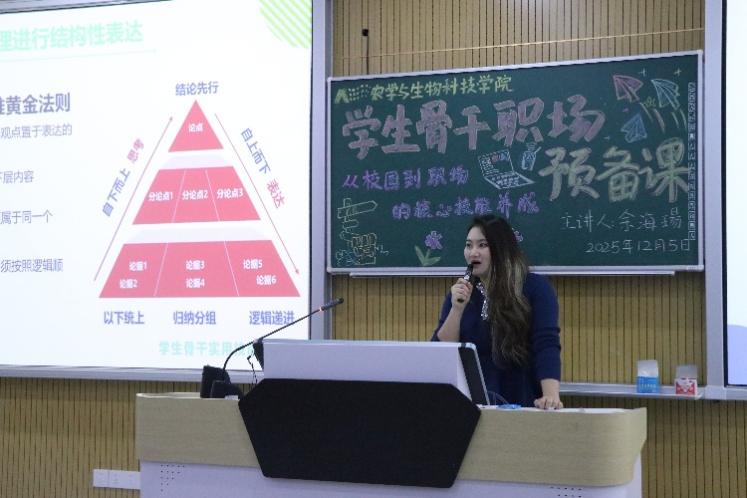 本次培训聚焦学生骨干实用技能,设置了清晰表达、高效工作、职场礼仪三大核心板块,内容兼具理论深度与实践指导性。在“清晰表达:结构化思维”环节,余海瑒系统阐释了结构性思维的核心理念。她结合麦肯锡经典的金字塔原理,从结论先行、以上统下、归纳分组、逻辑递进四个维度展开讲解,并通过列举贴近学生生活的场景案例,直观呈现了非结构化表达与结构化表达的差异,期间还与学员展开即时互动,课堂氛围轻松且高效。同时,她还援引《神奇的数字7》中大脑短期记忆规律,说明合理归纳分组对提升信息传递效率的重要性,引导学生骨干在日常沟通与工作汇报中运用金字塔原理,实现“想清楚、说明白”的表达目标。