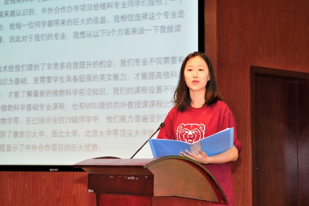 在学生代表发言环节,2021级杨潇然同学分享了她近3年的学习经历和感受,以及自己的成长和收获,对植科项目相关的领导、老师,以及项目提供的各种资源,表达了诚挚谢意。2023级新生代表张依扬在发言中谈到在人生最美的年华里不仅要学会仰望星空,更要脚踏实地的刻苦学习,将要充分利用项目提供给的各种资源,认真学习专业知识,积极投身社会实践,逐步提高语言能力,不断培养国际视野,成为最优秀的自己。